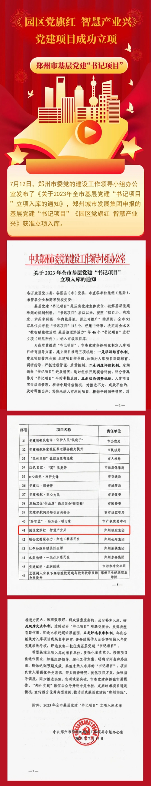 該項“書(shū)記項目”主要致力于推動(dòng)黨建與產(chǎn)業(yè)園建設、招商和運營(yíng)的深度融合,充分發(fā)揮黨建引領(lǐng)作用,切實(shí)為園區企業(yè)提供“一站式”的黨建服務(wù)、政務(wù)服務(wù)、創(chuàng )新創(chuàng )業(yè)服務(wù)、社會(huì )生活服務(wù)等,為企業(yè)發(fā)展增效賦能,推動(dòng)產(chǎn)業(yè)園黨組織和黨的工作覆蓋更加有效、體制機制更加科學(xué)、黨組織建設更加規范、黨員教育管理更加精準、基層黨組織保障更加有力,園區黨建品牌更加響亮,示范作用更加凸顯,形成具有國企特色、符合鄭州實(shí)際的產(chǎn)業(yè)園黨建工作舉措,以高質(zhì)量黨建引領(lǐng)和賦能園區高質(zhì)量發(fā)展,致力打造在全省、全市具有標桿作用和示范效應的“黨建+產(chǎn)業(yè)園”新名片。