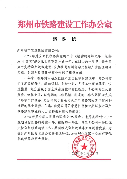 同時(shí),城發(fā)集團大力支持鄭州鐵路建設,全力推進(jìn)鄭州南站及樞紐產(chǎn)業(yè)園項目實(shí)施,超前謀劃、主動(dòng)作為,各項工作高效落實(shí)、快速推進(jìn),充分展現了國企政治站位和責任擔當。做一件好事,添一份美麗 ,再收到鄭州市鐵路建設工作辦公室的感謝信!