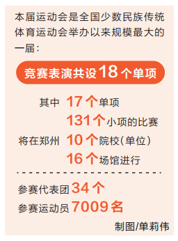 據(jù)競賽表演部相關(guān)負(fù)責(zé)人介紹,本屆民族運(yùn)動會競賽表演共設(shè)18個(gè)單項(xiàng),馬上項(xiàng)目比賽已于7月12日至17日在呼和浩特圓滿結(jié)束,其他17個(gè)單項(xiàng),131個(gè)小項(xiàng)的比賽將在鄭州10個(gè)院校(單位)、16個(gè)場館進(jìn)行;參賽代表團(tuán)34個(gè),參賽運(yùn)動員7009名,是全國少數(shù)民族傳統(tǒng)體育運(yùn)動會舉辦以來規(guī)模最大的一屆。另外,本屆運(yùn)動會還將突出河南省武術(shù)大省的優(yōu)勢,“少林拳”和“陳氏太極拳”等也將一一呈現(xiàn)。