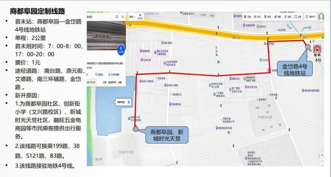專(zhuān)線(xiàn)開(kāi)通后,商都阜園項目租戶(hù)及業(yè)主實(shí)現了“出門(mén)即坐上公交,下車(chē)即地鐵口”的通勤效率新格局。線(xiàn)路途徑南臺路、鼎元街文德路、南三環(huán)輔路;中途包含超市、理發(fā)店、小商品城等便民商業(yè)點(diǎn)。無(wú)論是上班還是購物,都能享受到高效、舒適的出行體驗。線(xiàn)路單程2公里,除直達地鐵口外也可換乘199路、38路、S121路、B3路。不僅解決了租戶(hù)的通勤難題,也為周邊社區居民提供了便利,得到了大家的一致好評。